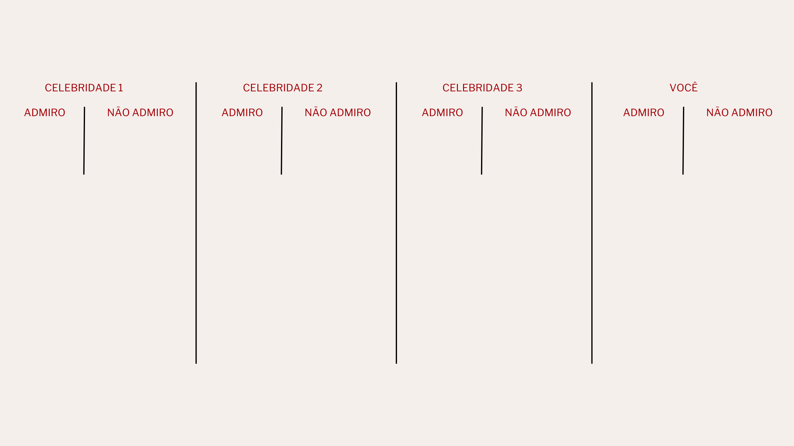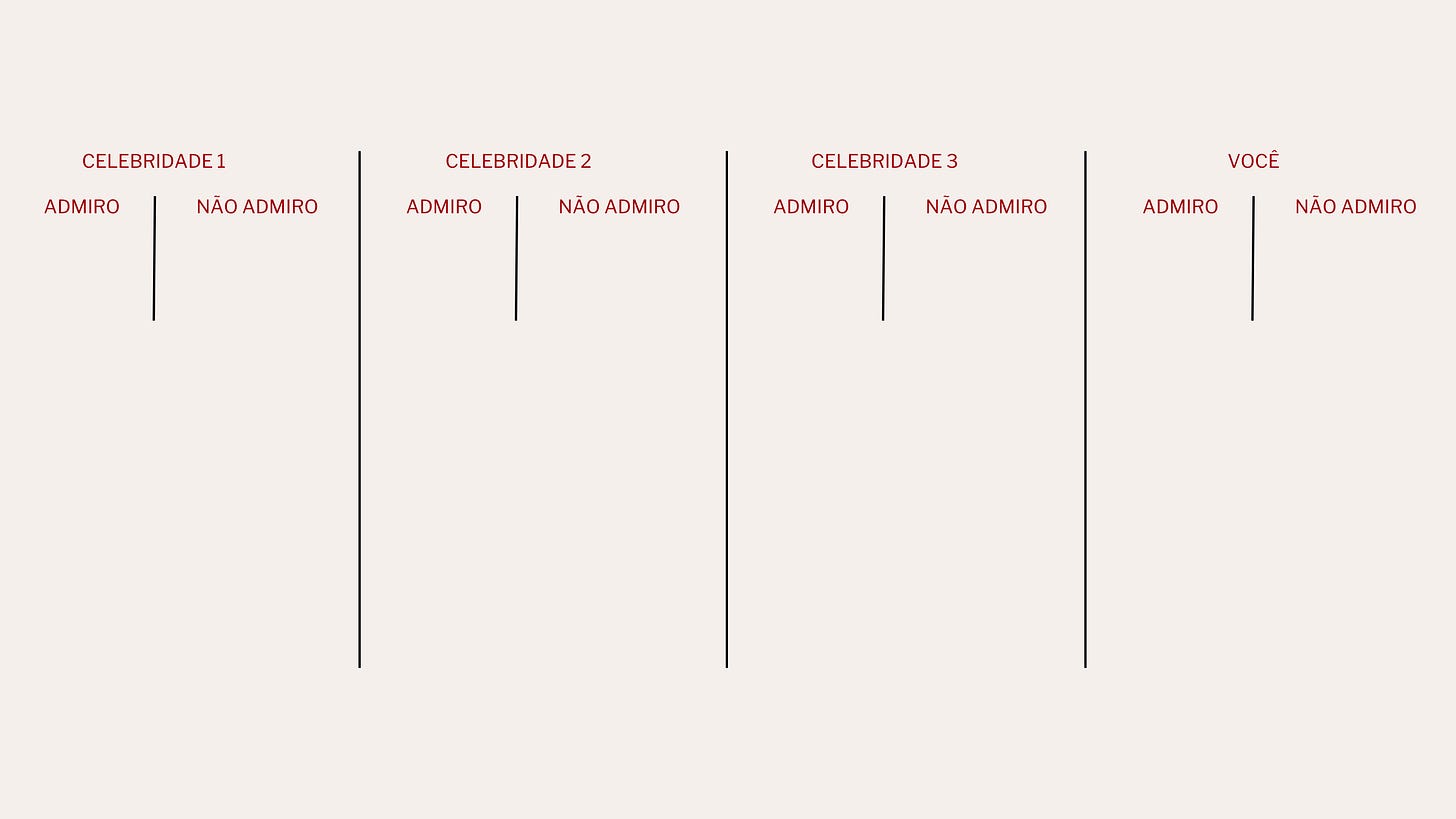 sugerindo esse mesmo exercício dia desses. eu amo quando estou em sintonia com quem admiro.é o seguinte: escolha 3 pessoas que você admira muito. não vale ninguém da sua família, ok? alguém do seu ramo profissional, uma celebridade, alguém bem grandão! divida uma folha em 4 blocos. em cada bloco, escreva o nome de uma celebridade e no último, escreva o seu. embaixo de cada nome, faça duas listas. uma das coisas que você admira, outra das coisas que você não admira ou não concorda, não gosta, faria diferente.